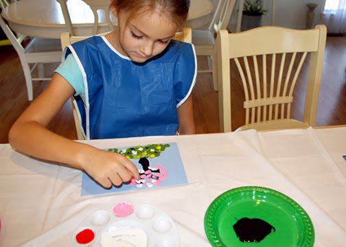 Tessa mixed red and white paint that she used to dot pink flower blossoms onto a spring tree.